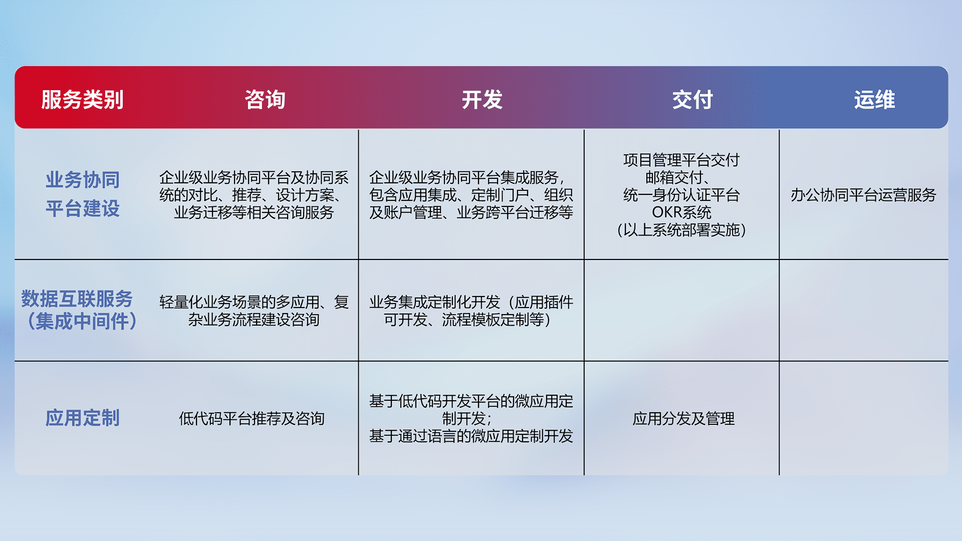 针对钉钉、、、、企微、、、、IDaas等平台级产品提供产品的规划、、、、方案、、交付、、、定制化开发等服务,,,实现如统一协同办公、、智能客户服务、、混合会议管理、、智能数据查询、、等业务场景,,实现数字化转型。。。